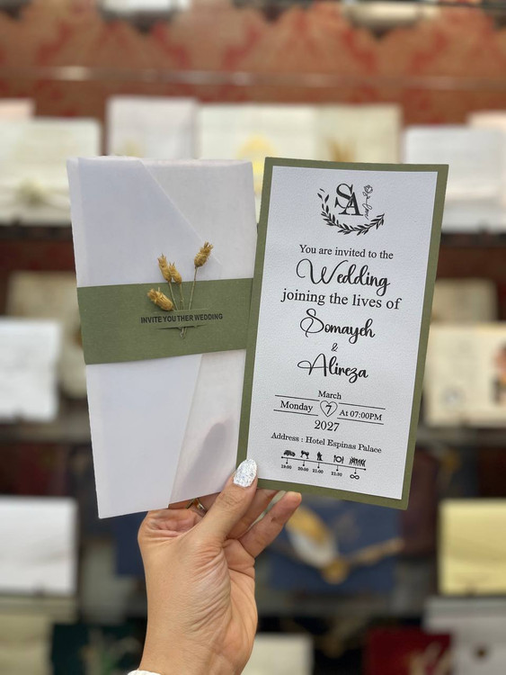 - پاکت سفید کالکی با بند سبز زیتونی و تزئین خوشههای گندم خشک